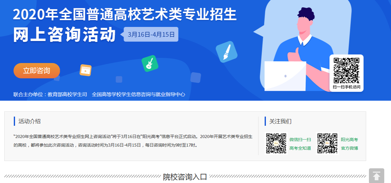 “2020年全国普通高校艺术类专业招生网上咨询活动”将于3月16日在“阳光高考”信息平台正式启动。2020年开展艺术类专业招生的高校,都将参加此次咨询活动,咨询活动时间为3月16日-4月15日,每日咨询时间为9时至17时。