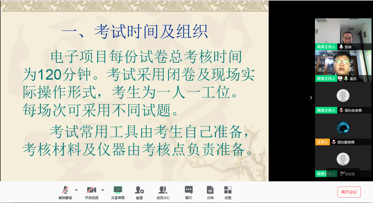 本次讲座,邀请了乐鱼在线电子工程系张林老师和雷迅老师担任主讲。张林老师围绕“点长车电路的安装与调试”、“正反转电路的安装与调试”、“星三角降压起动电路的安装与调试”等典型任务,对电工技能训练等知识进行了详细分析和讲解。雷迅老师从“考试时间及组织”、“考核内容及权重”、“考试标准”等方面,针对对口单招电子电工技能考试标准进行了解读。