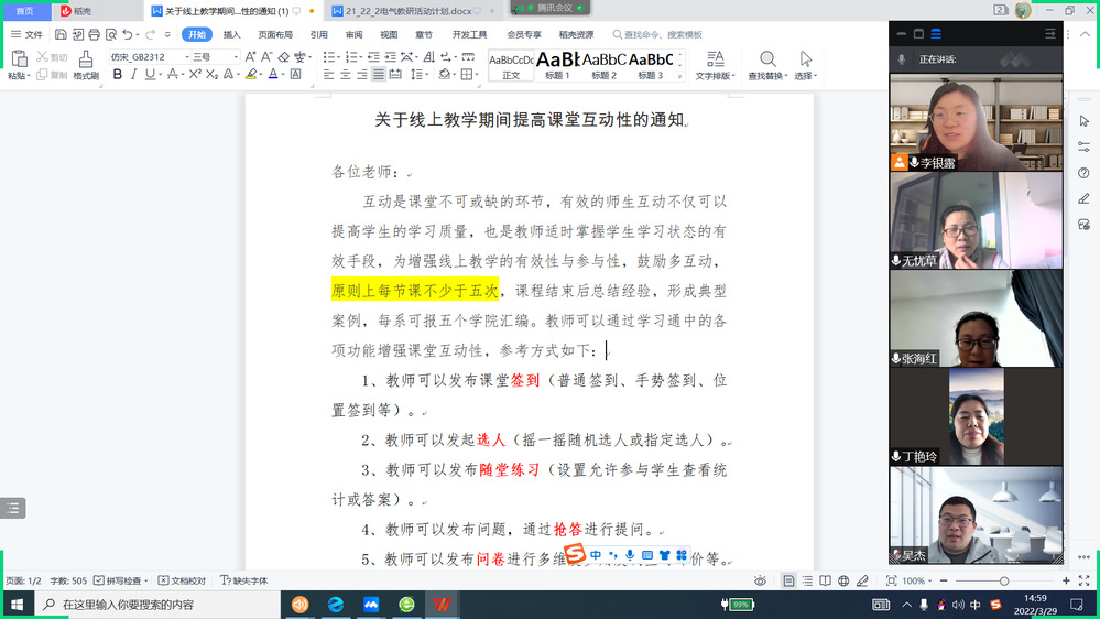 互动是课堂不可或缺的环节,有效的师生互动不仅可以提高学生的学习质量,也是教师适时掌握学生学习状态的有效手段,为进一步提高电气自动化专业教师课程教学能力,增强线上教学的有效性与参与性,3月29日下午,电气自动化教研室线上开展了线上教学经验分享会,会议由李银露老师主持。