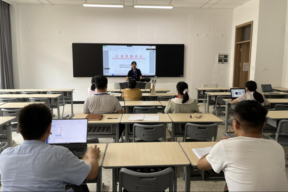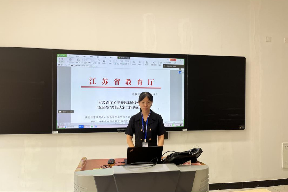 然后,参会老师一起学习《江苏省职业教育“双师型”教师标准(试行)》文件,并根据文件内容分析了认定初级、中级与高级“双师型”教师需要的条件。在学习完文件后,各位老师根据自己的情况填报认定工作的预登记表。