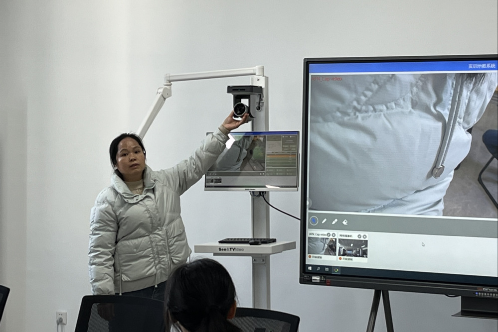 王晓峰先为在座老师介绍了可视化示教设备的各个组成部件,并详细讲解了可视化示教设备的各项功能;她将可视化示教设备与移动智慧屏连接,生动地展示了示教设备的强大功能与实际运用方法。